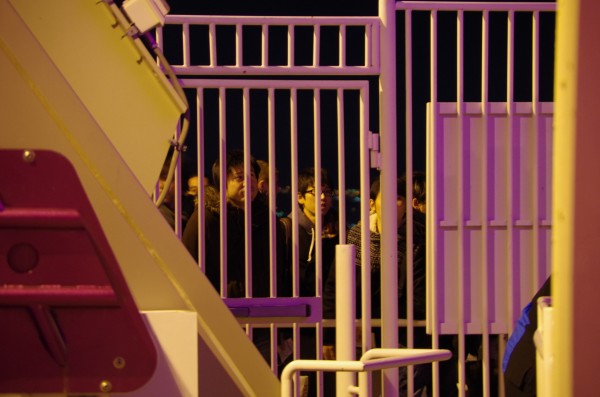 コースターに乗って一気に展望台から外に飛び出すアトラクション。