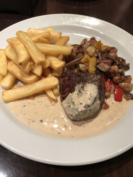 ホテルでのステーキ、ピザはとても美味しく付け合せは醤油のような味がしていて文句の付け所がなかった。