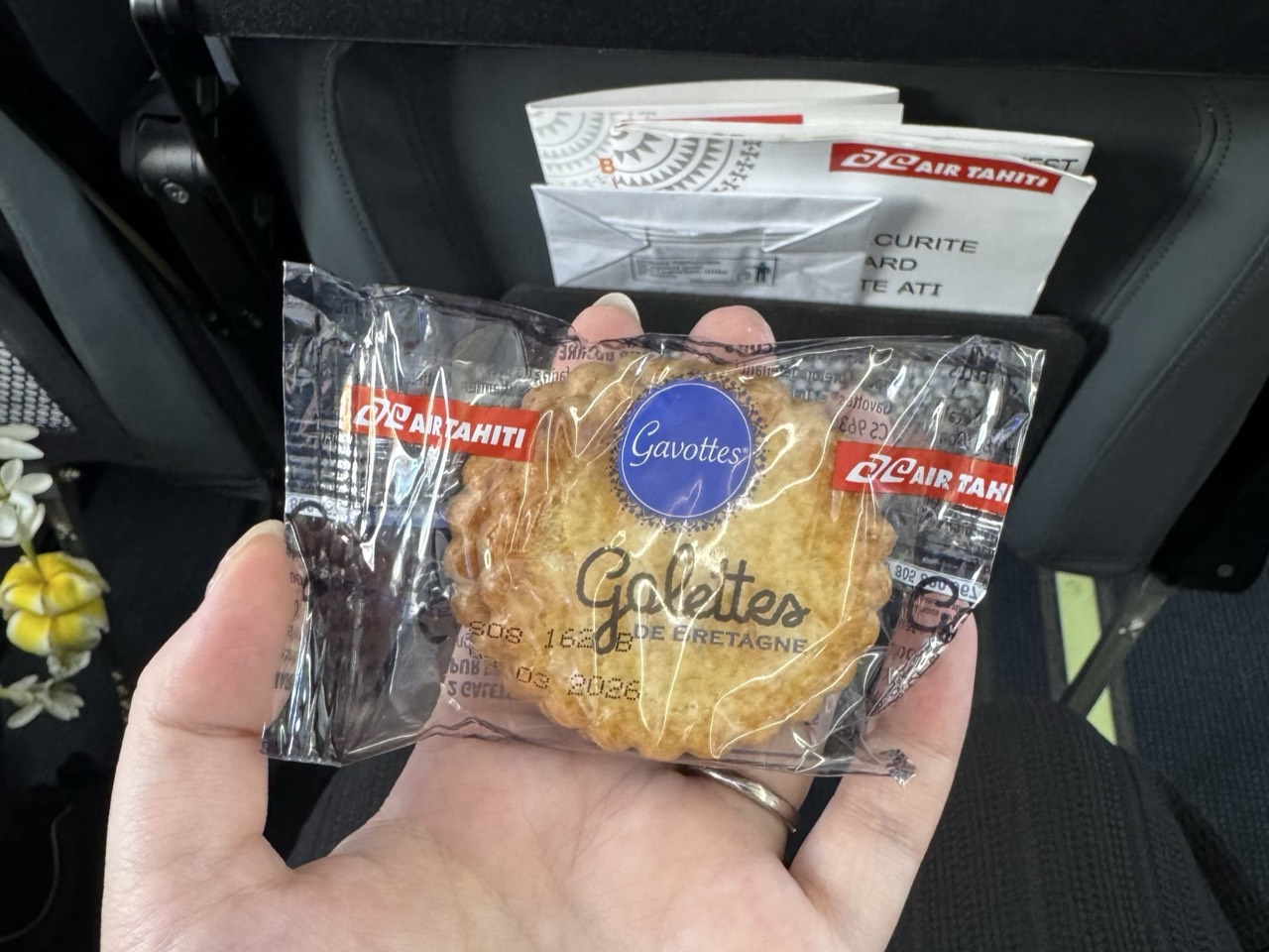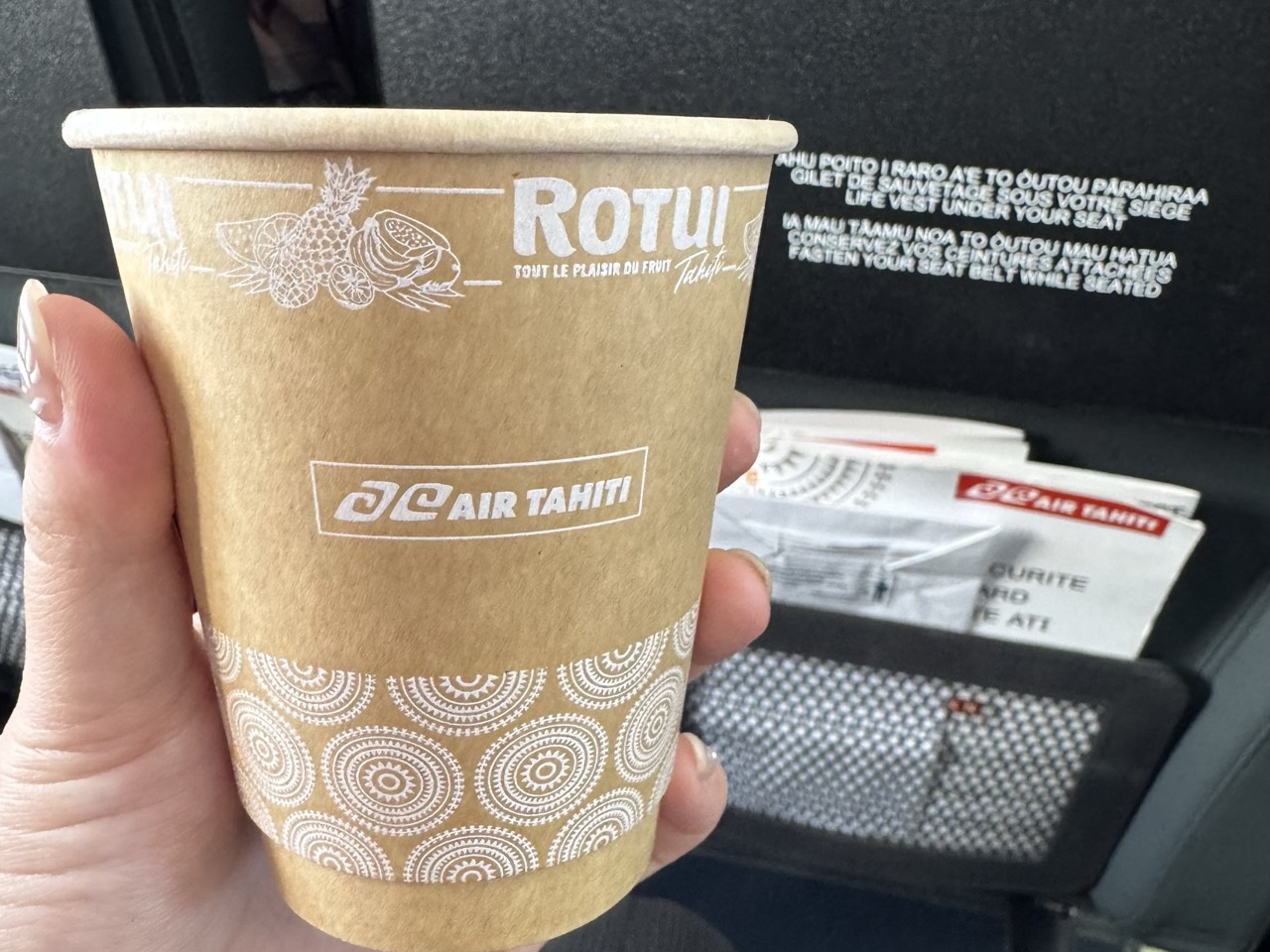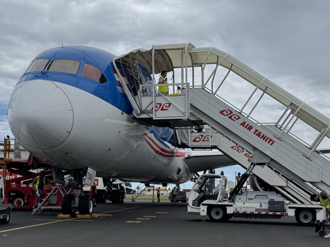 成田空港からタヒチまで直行便が週に二回出ています。フライト時間は11時間です。今回、隊長含め全員が初めてのエアタヒチに乗ります。マリンブルー色の外装と機内が特徴的です。
