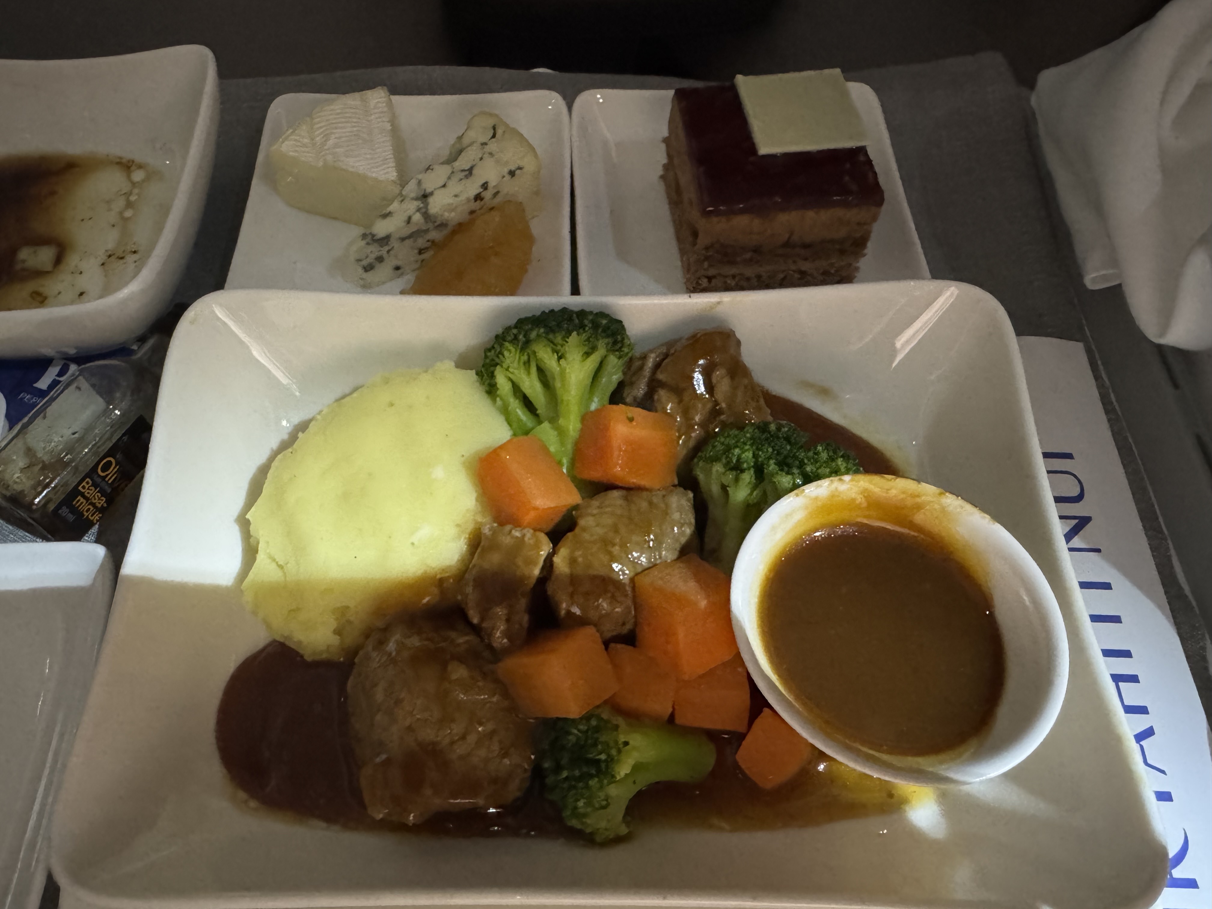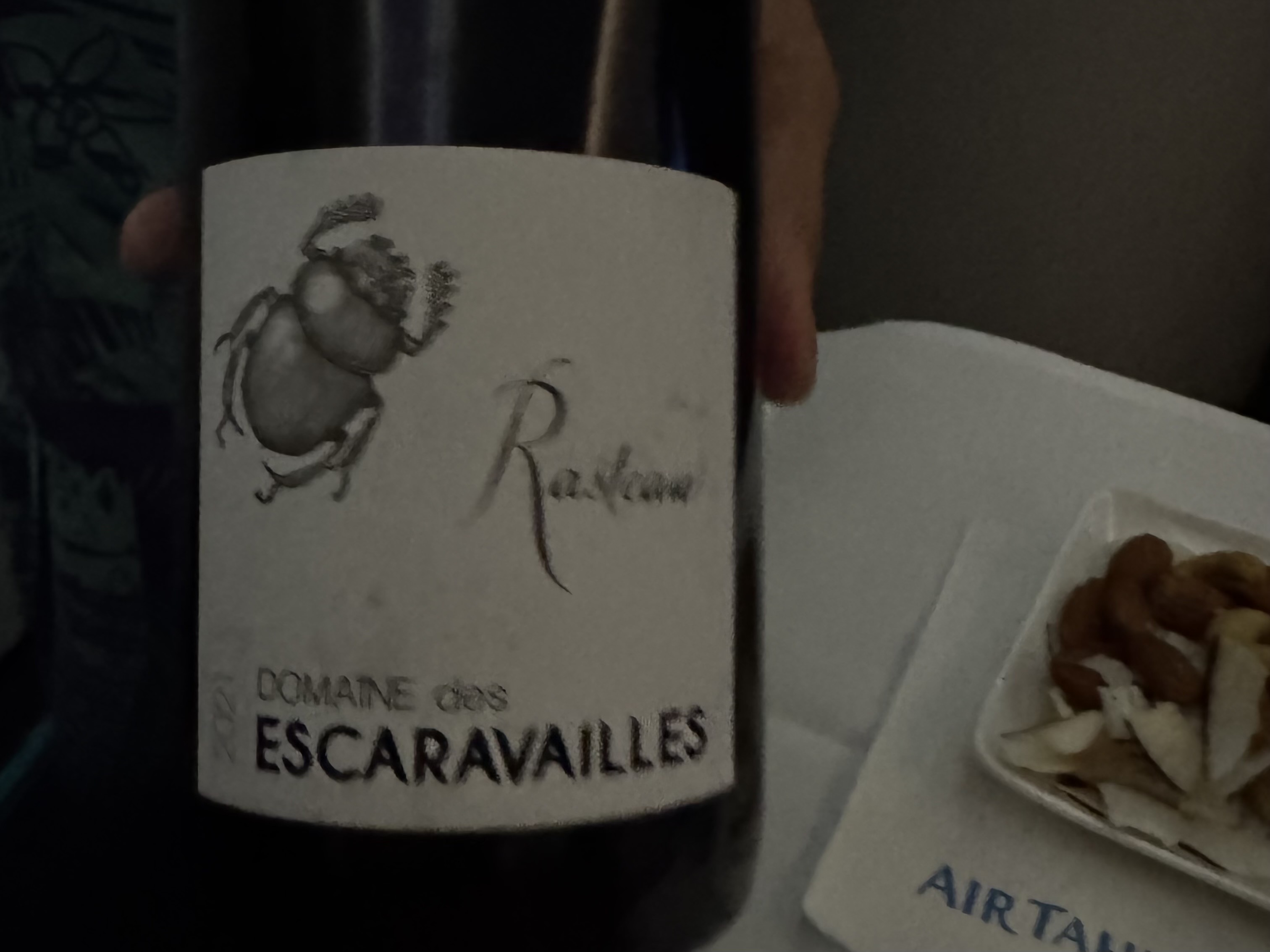 旅の初めの楽しみといえばまずは機内食。MMリッチは、メイン料理に赤ワインソースで煮込んだ牛肉料理を選択。選んだ料理に合うワインは、こちらの「Domaine des Escaravailles」とのことで、いただきました。