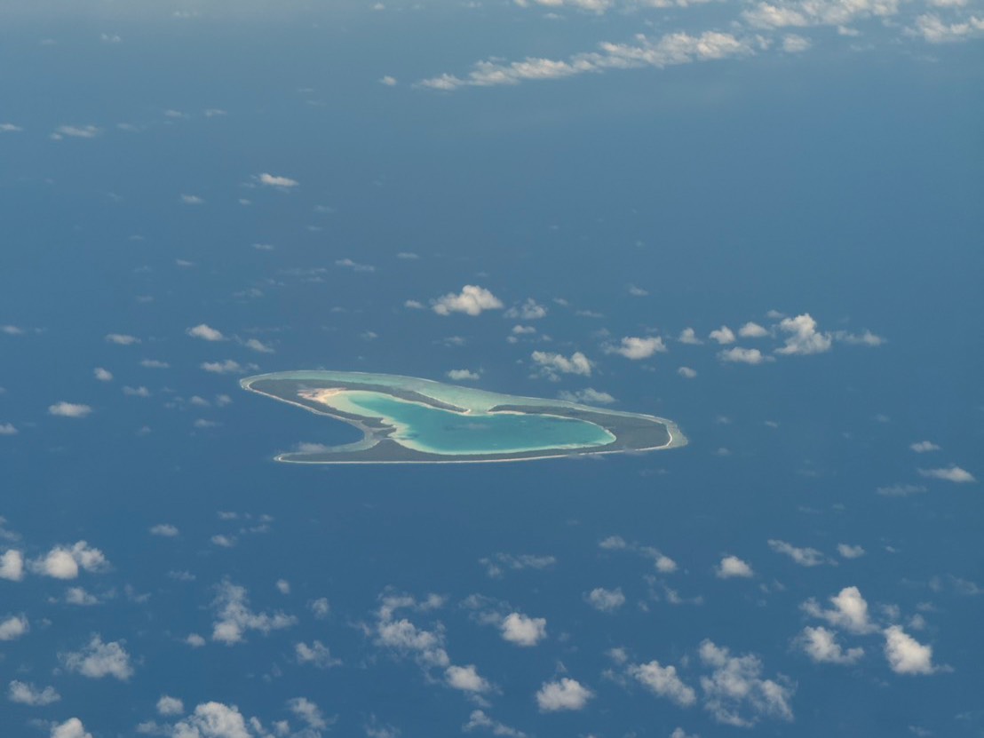 着陸まで残り30分ぐらいに、進行方向右側の窓から外を覗くとマウピティ島が見えてきました。島の形がハート型に見えたので思わずパシャリ。