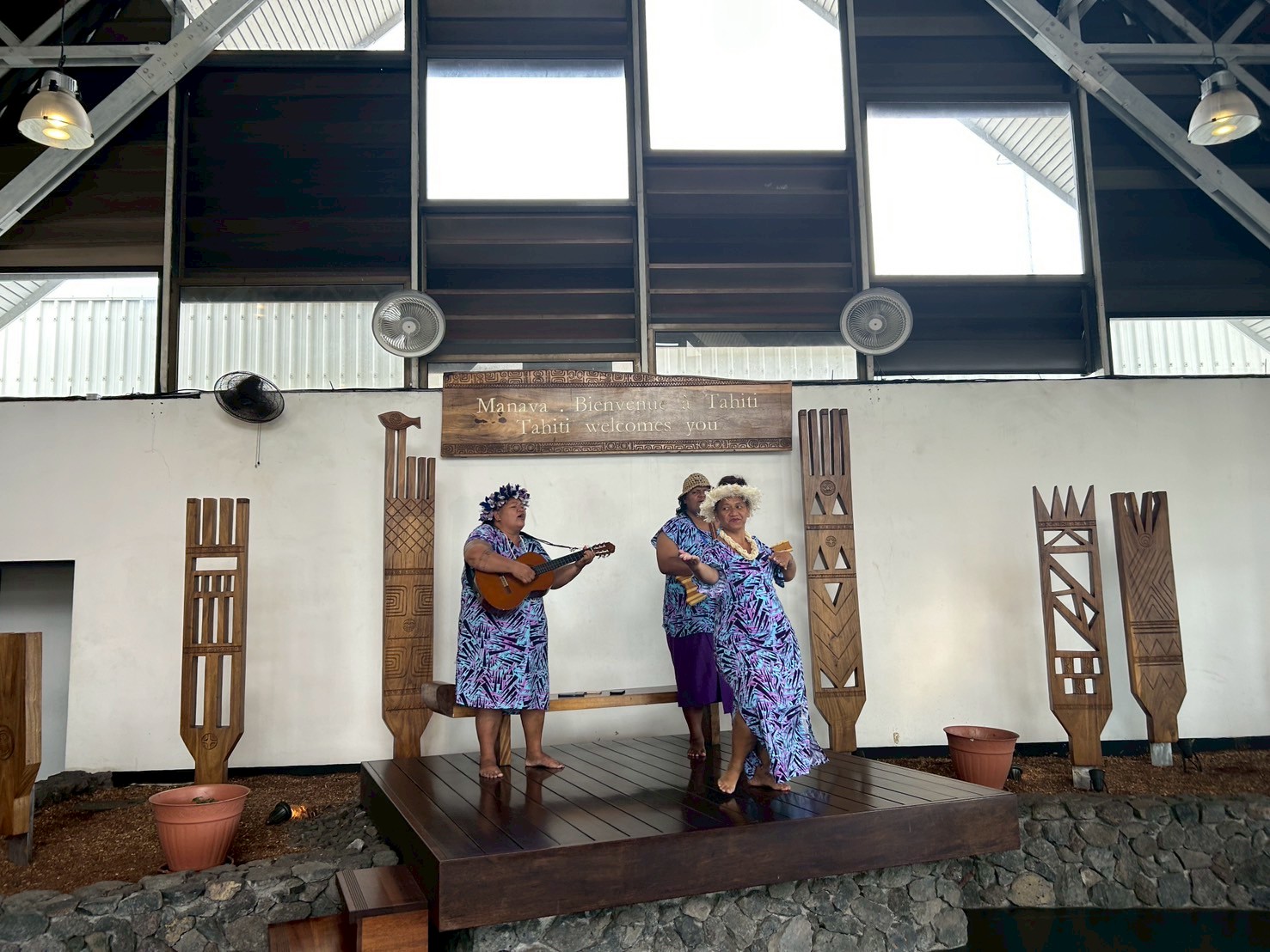 タヒチに到着しました。空港に入ってすぐに音楽とダンスでお出迎えをいただきました。