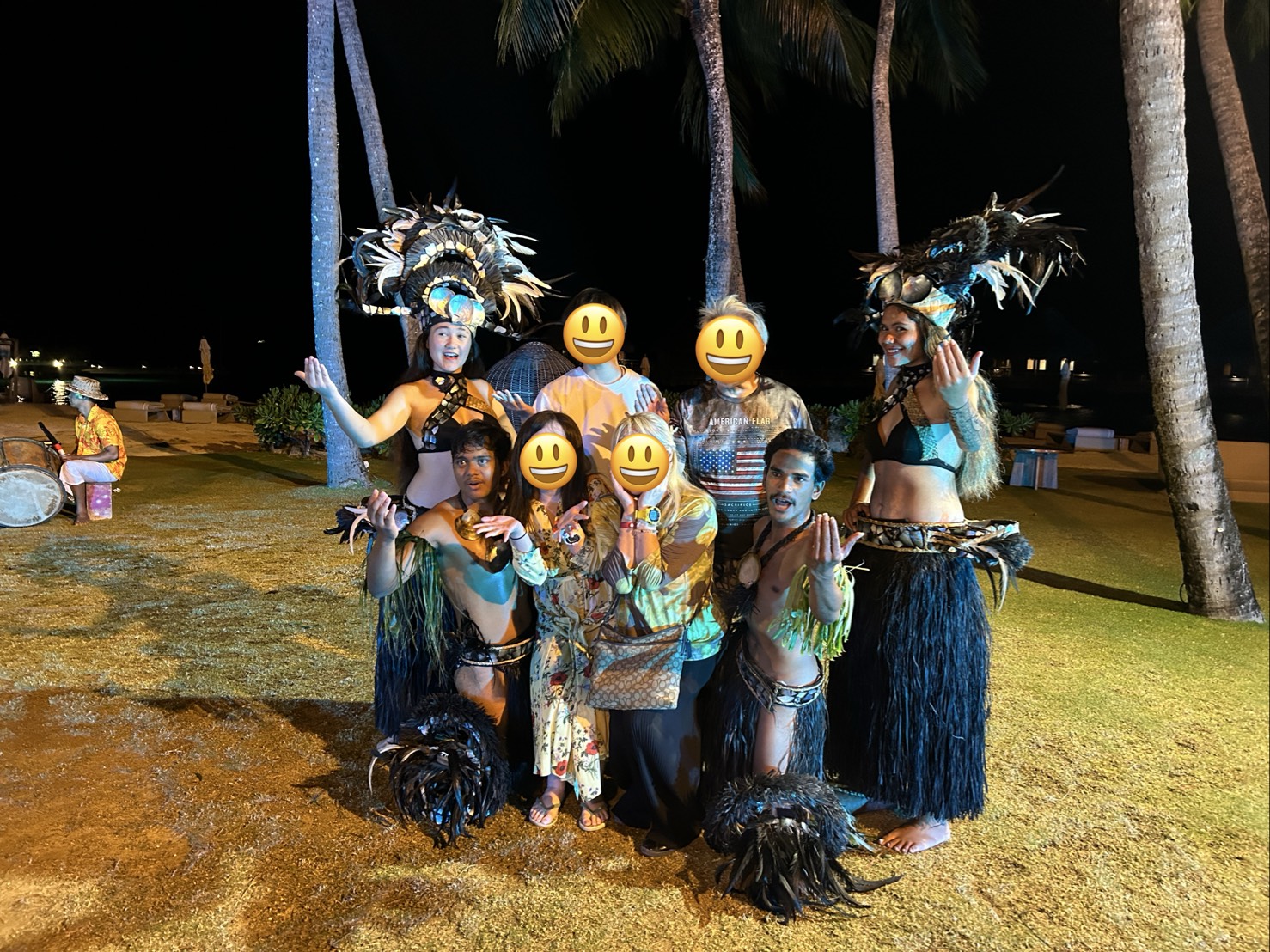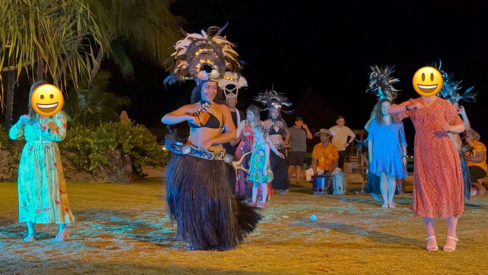 19時からはボラボラのダンスのお披露目。男性は大きく派手な装飾品を身につけて逞しい声で踊り、女性は色鮮やかで華やかのドレスに、鳥のようなかわいい声で踊りを披露してくれました。
