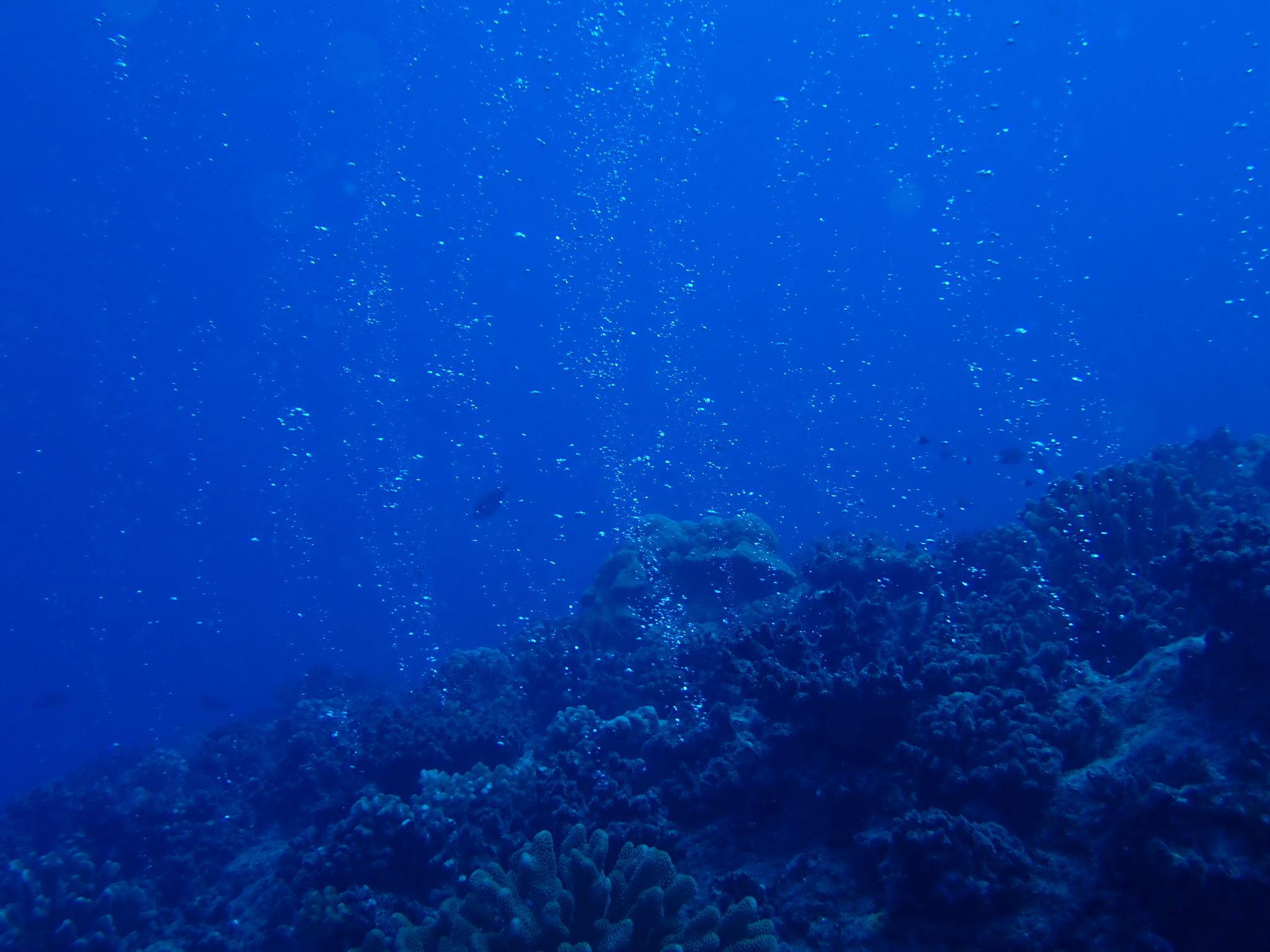 一気に深いところに潜行していきますので、ダイブコンピューターを確認しながらBCDに空気を足していき、そして同時に耳抜きもしながら、マダラトビエイの群れを見るポイントまで泳いでいきます。