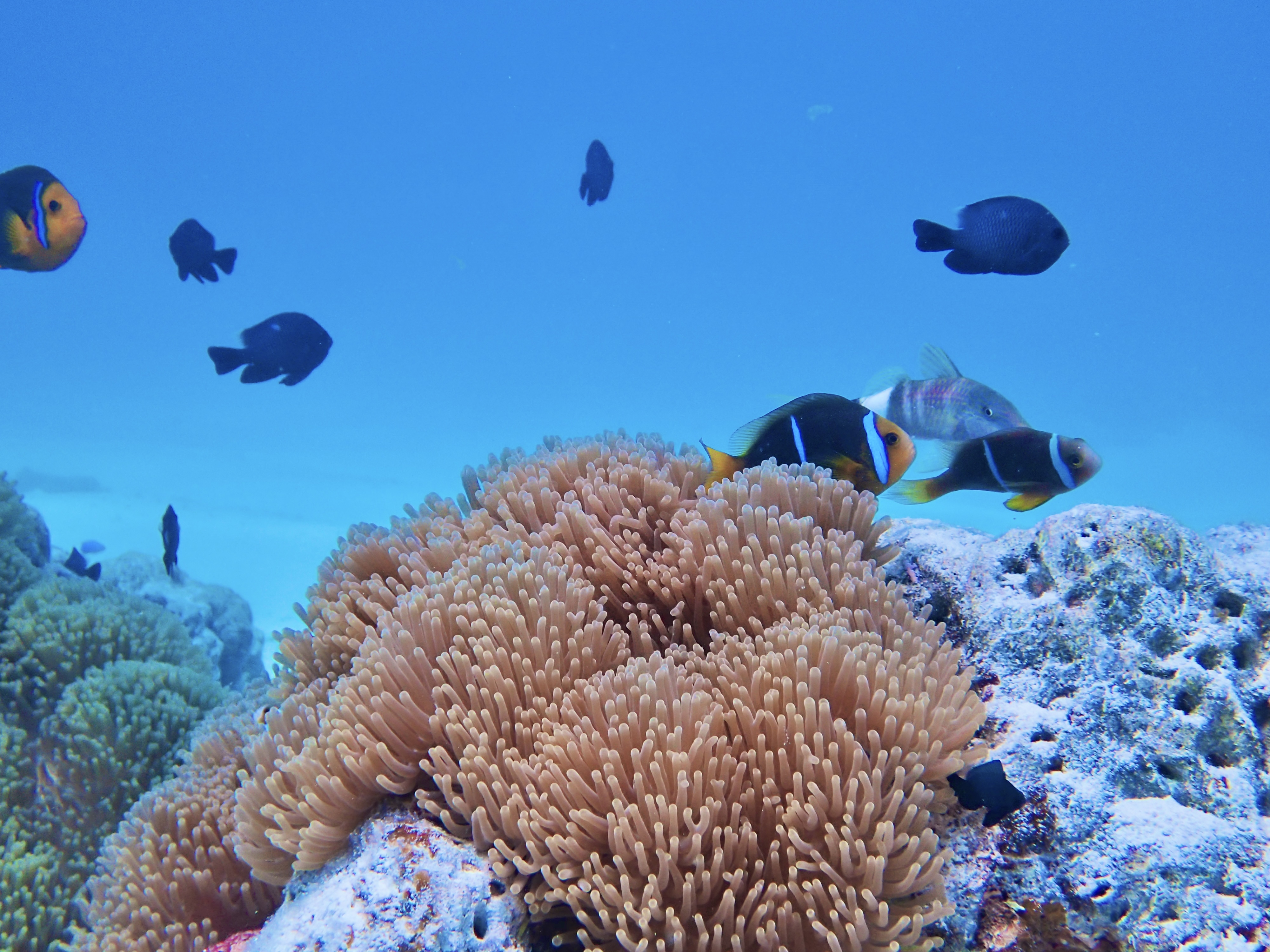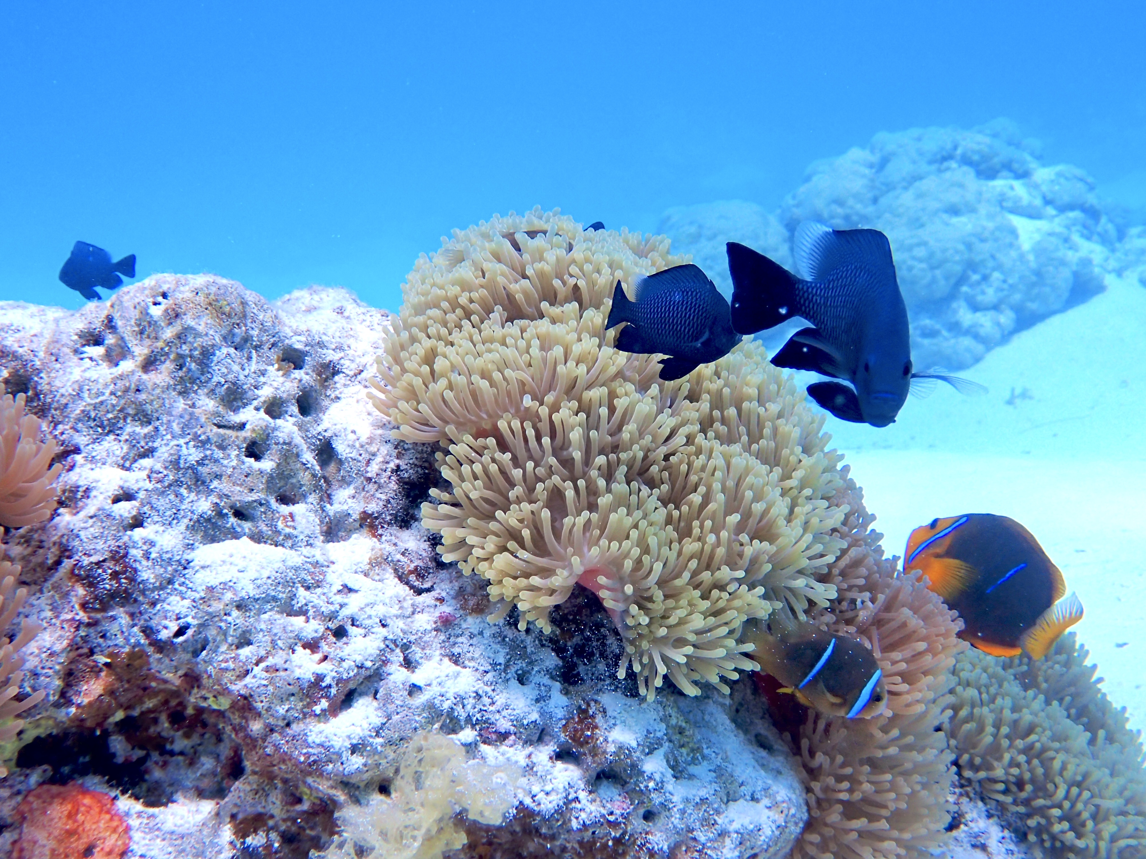 そして2日目に行けなかったコーラルガーデンへ。深さが10m満たないこの場所は、色鮮やかな魚、サンゴ礁を楽しめます。ここも餌付けをしている場所なので魚がたくさん寄ってきて囲まれることもあります。まるで人魚姫になった気分です。砂は白くて透視度30mを超える場所なので動画・撮影すると本当に美しい景色しか取れません…!