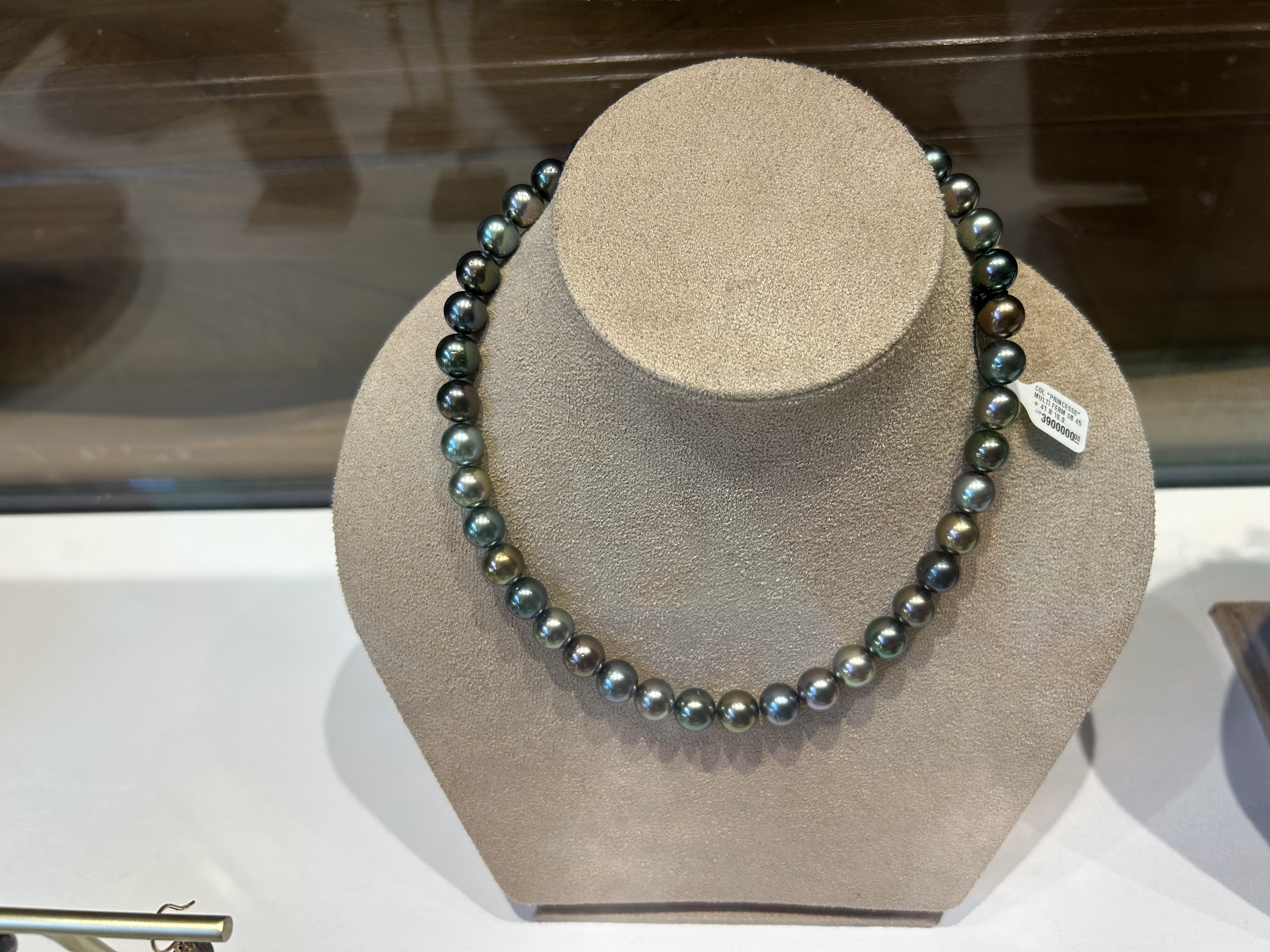 一方、すがさんは宝飾店を訪れていました。タヒチといえば黒真珠です。宝飾店で黒真珠のネックレスを作る職人さんにこのお店で一番高い黒真珠を見せてもらいました。