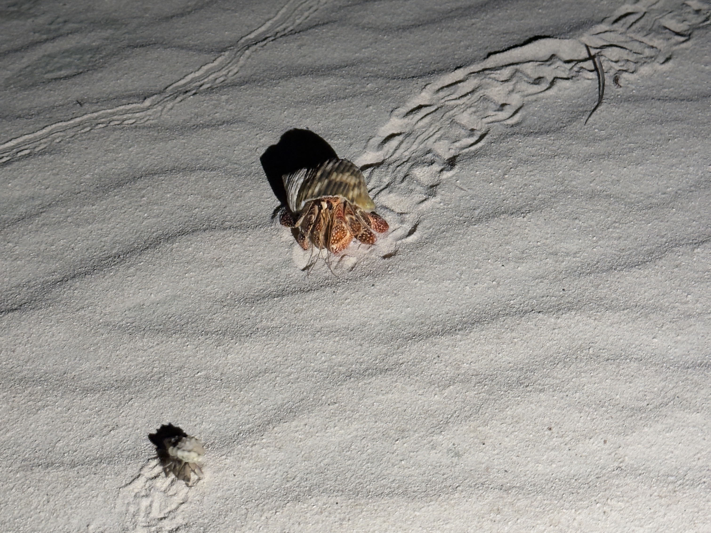 バルさんの撮影の邪魔にならないようにMMリッチは少し離れていました。真っ暗闇が少し怖かったので下に向けてスマホのライトを付けました。砂浜にはヤドカリの足跡があってその中でも一際大きい足跡があったのでその足跡をスマホの光でたどっていくと…