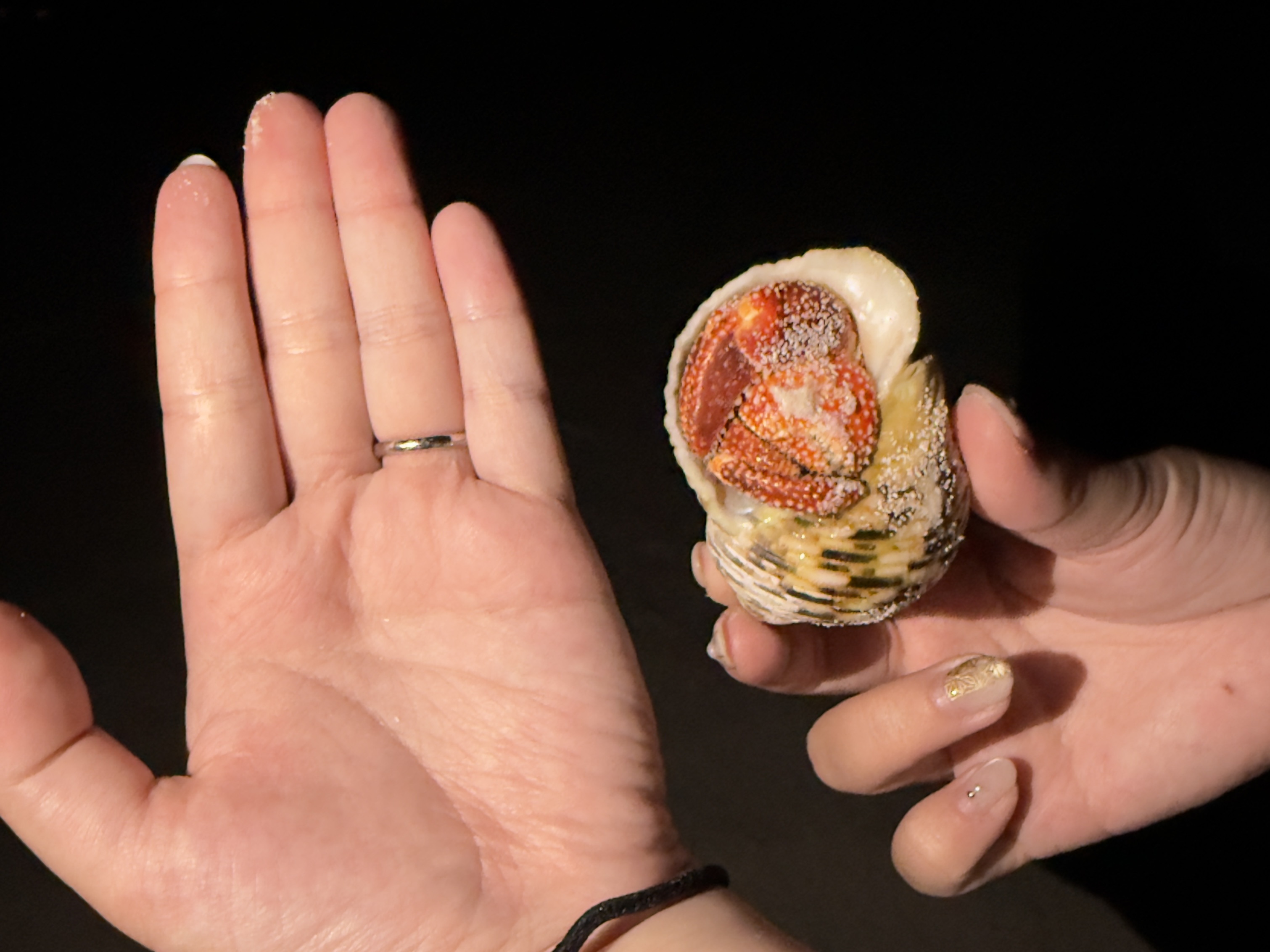 手前のヤドカリと比べてみると大きさは歴然。MMリッチは目をまんまるくして恐る恐る近寄って手を広げました。