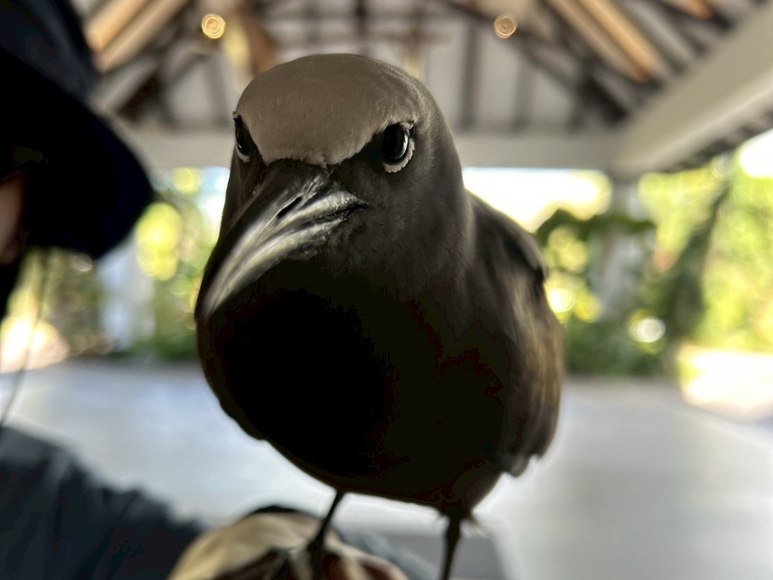 その後、タクシーでホテルへと戻るとカラスのような大きな黒い鳥がいました。近寄っても逃げない人慣れした鳥だなと思っていたら、ホテルで飼っている鳥だったみたいで、皆さん順番に手に乗せてもらいました。調べてみるとヒメクロアジサシという鳥のようです。