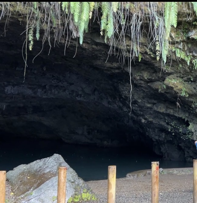 洞窟の天井には緑豊かなシダやコケが生えています。洞窟自体は大きいですが洞窟の中だけを切り取ると天井が低く小さな洞窟のように見えました。天井から落ちる雫がキラキラと光って綺麗でした。
